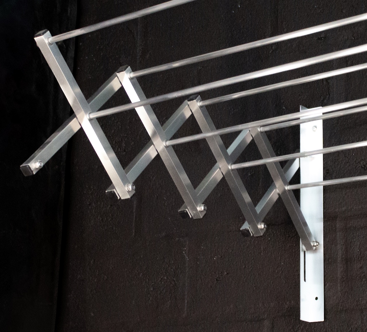 It is designed for Cape weather conditions so it is made from rust free material and is very sturdy when Mounted with 4 Stainless steel coach bolts with an 8 mm wall plug. The two sides are made of square tube aluminium forming the frame with round tube aluminium bars forming the hanging space.